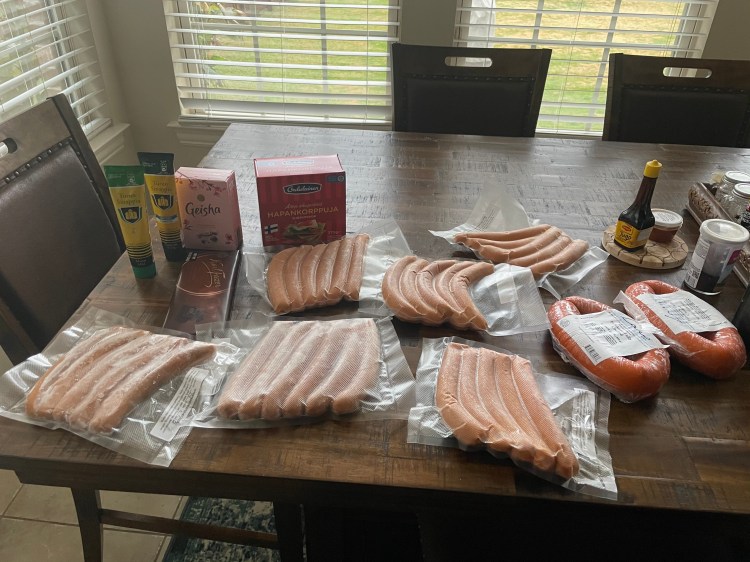 Most regular hot dog wieners are made of beef so they won’t be ideal. Kiuasmakkara must be fatty, floury and pork meat based. Another reasonable option could be Meica Deutschländer but Mein Gott, don’t spend $35 on this via the provided rip off link. If you have an international supermarket of some kind in your neighborhood, that’s a good place to start.
