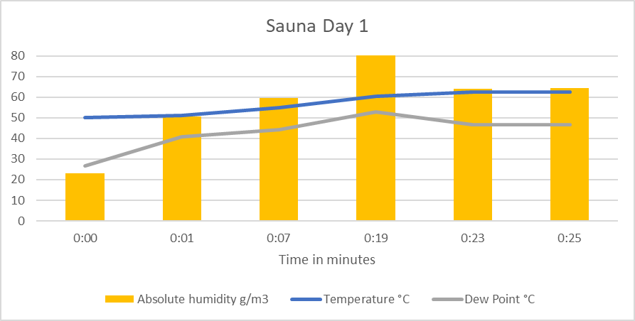 The next day I warmed the sauna a little bit more and started the session when it was 65c. I repeated two 10-minute sessions with about a five-minute break in between. Like the day before, there was about 70 grams water per cubic meter in the air but because the temperature was higher, the dew point was higher too.