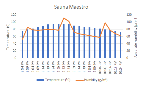 In other sessions earlier this summer, I have tried the limits of the stove. Once I reached 100.31C temperature and shut down the stove because I thought my thermometer cannot take that temperature for very long. I filled the Maestro and got the humidity to 116 g/m3. That translated to only about 20% relative humidity but keep in mind that the dew point then was 60c so basically all surfaces less that 60 degrees hot including my body condensed steam to water like crazy. Interesting feeling all in all.