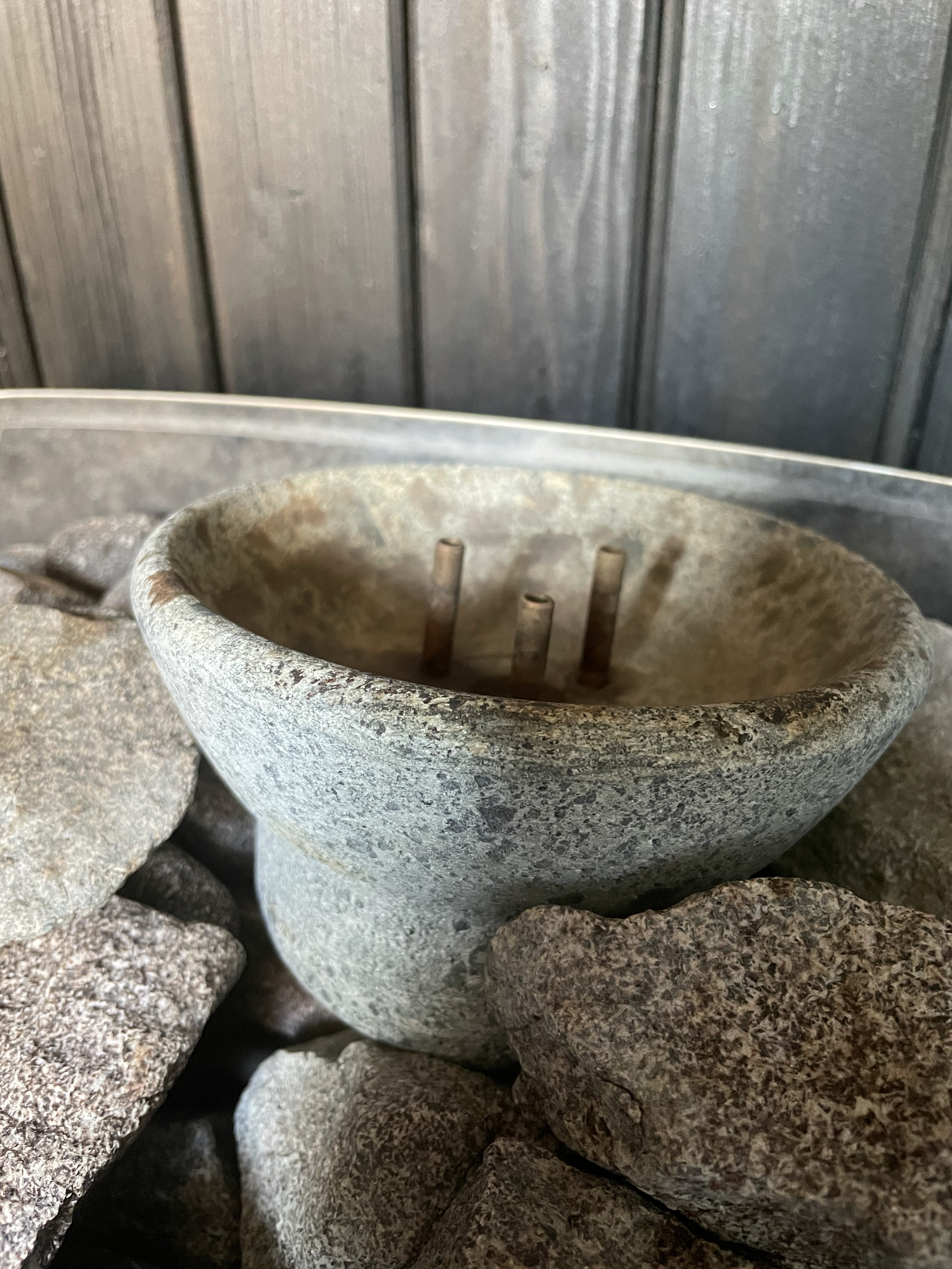 Anyway, this bowl is made of soap stone. You simply put it on the stove and let it heat up. Then when you start saunaing, you simply pour it full of water. At first the water evaporates just like when you pour water on regular sauna stones creating a nice steam. When you keep adding water, the bowl will cool down a bit and starts spitting the water out of the pipes on the stove. So, it’s almost steam automation.