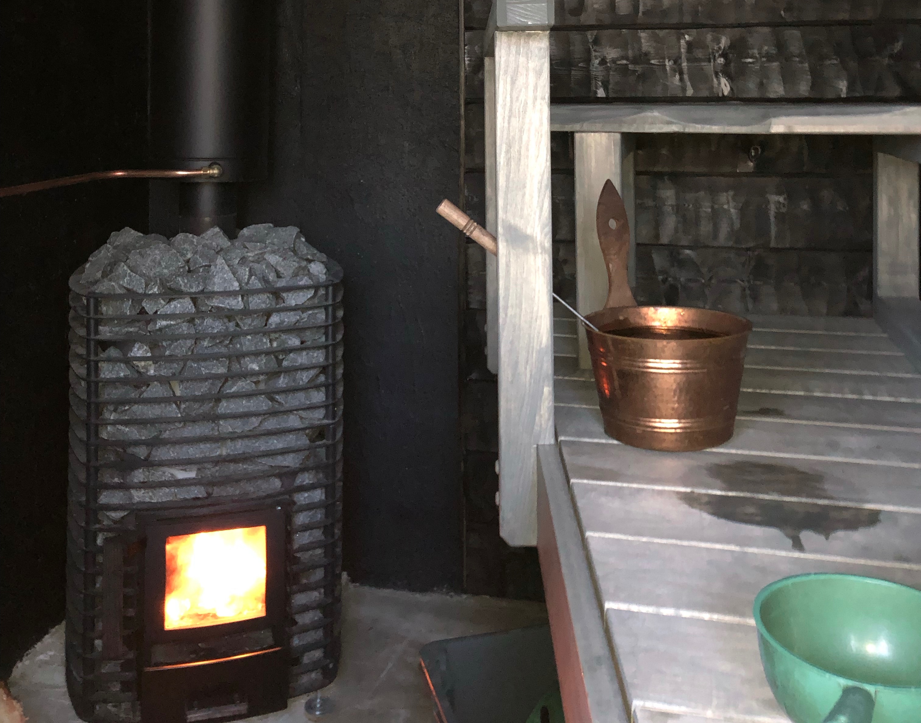 Many of these saunas have log walls. These logs suck a lot of heat so you need to size the stove accordingly: 8m3 sauna needs a 12m3 heater. Similarly, if there are many windows or a big glass door, you’ll need a bigger stove. Harvia provides a nice calculator on their site to find the right stove.
