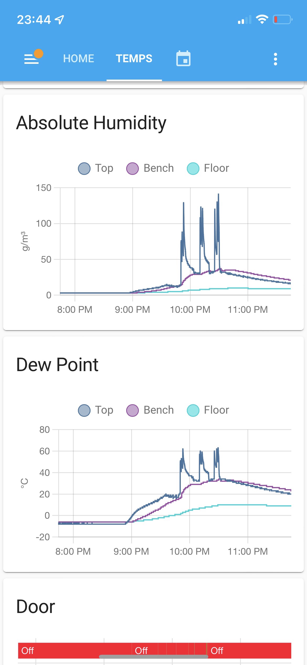 The most relevant integrations in the app are multiple temperature and humidity sensors: one for floor, one on the bench level, one on the top, and one measuring the temperature of rocks. Then there is a door sensor, led lights, and ventilation fans.