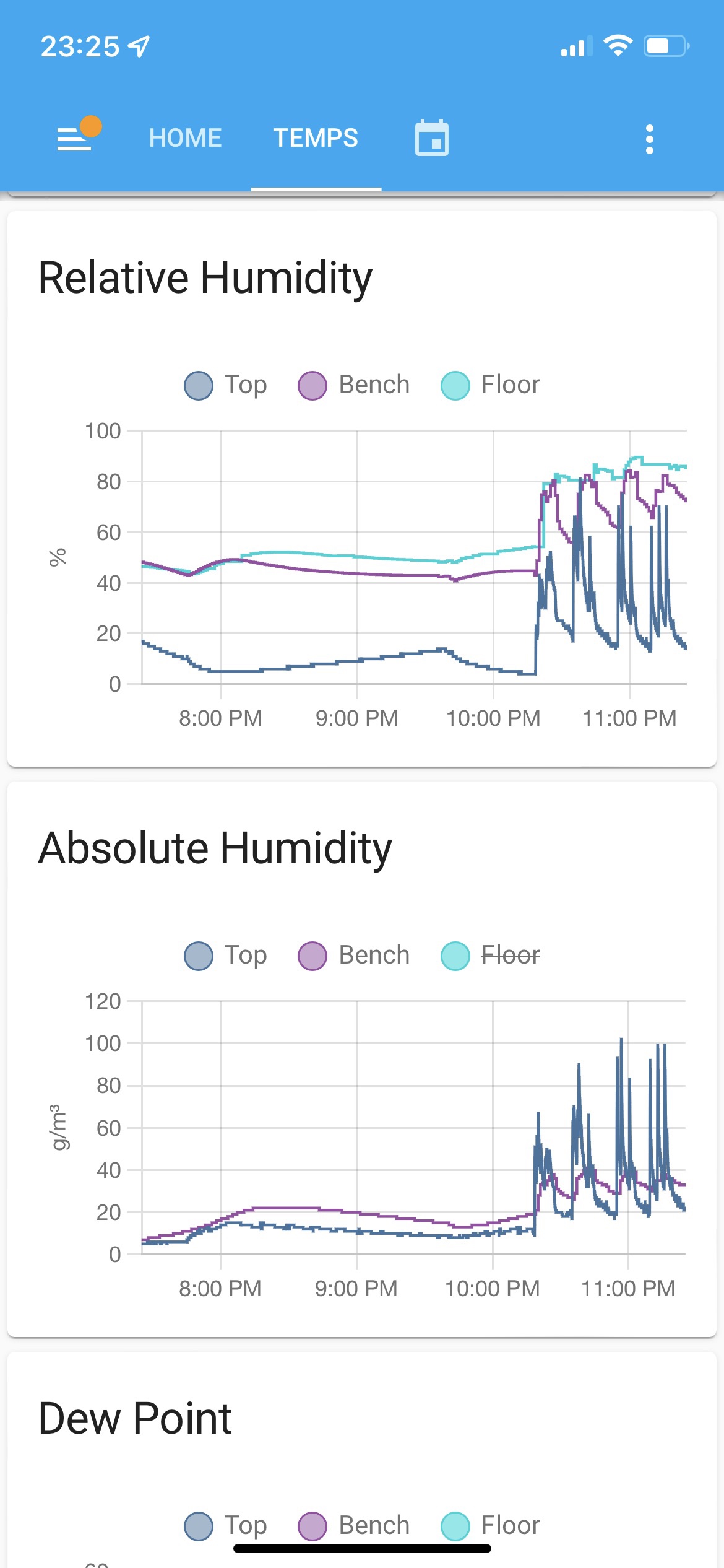 It is also easy to create history graphs and create own measures in the configuration. We have calculated absolute humidity from relative humidity for example because that is a much more relevant metric when analyzing steam in a hot room. From RH, we can also define dew point, that is quite interesting metric to analyze the quality of the steam.