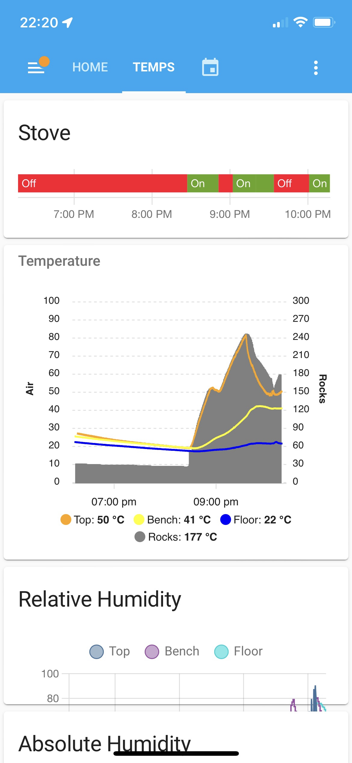 This automation kicks in when absolute humidity drops below 60 g/m3. Currently the app just asks to add water on the stove if the stones are hot enough to generate the steam. We put a thermo sensor on the stones and said that the stones must be at least 150C hot. Ideally the stones should be above 200C but 150C is still enough to generate decent steam in my sauna.