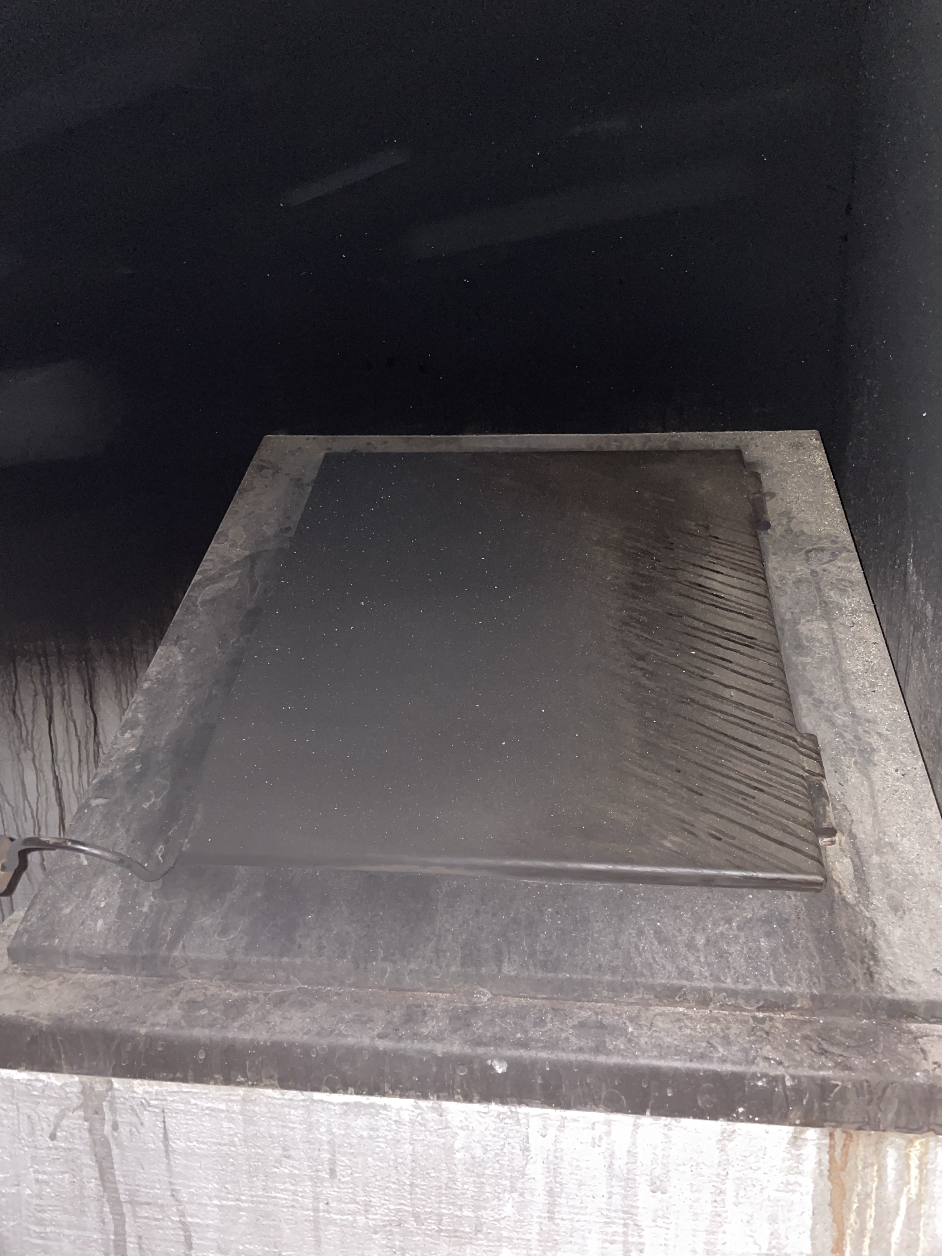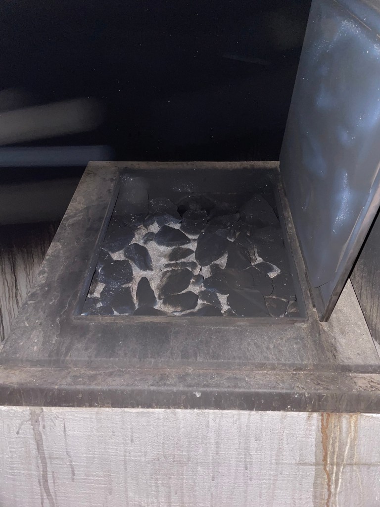 When you are ready to start the sauna session, you clear the oven of all the ashes. When you open up the latch of the oven, you will notice how a layer of ash and soot has accumulated on the stones.