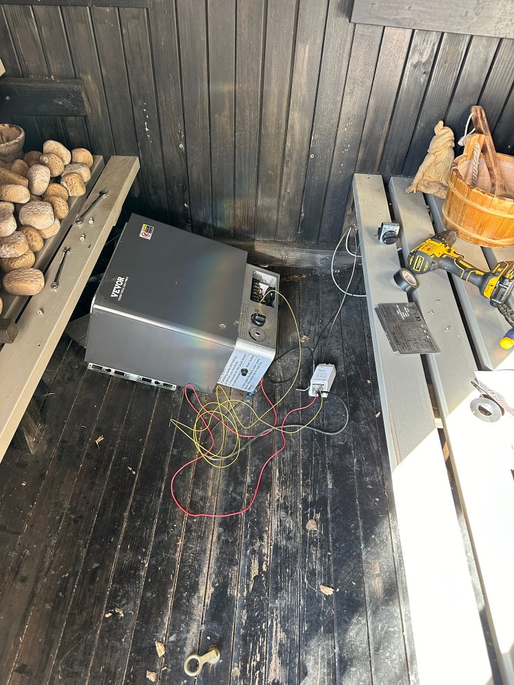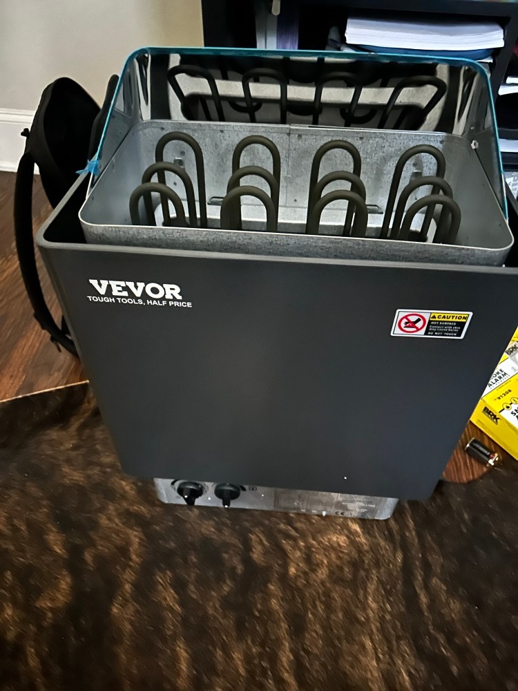 I ordered a basic 6kW Vevor stove from their website. The cost was $140 including sales tax and shipping and the delivery arrived in four days from order. At a first glance, the stove looked very similar to any basic 6kW stove: timer and power controls in the front, three coils, and a mandatory sticker telling that the stove might get a bit hot. Vevor marketing team beats other brands 6:0 with their slogan: tough tools to your sauna everybody!