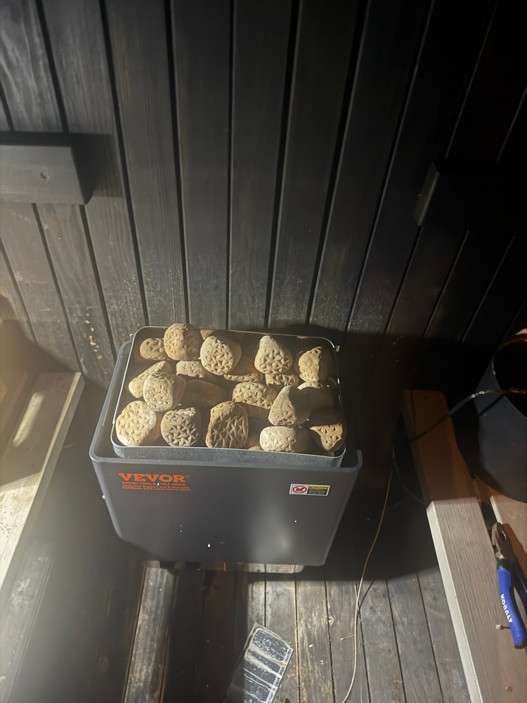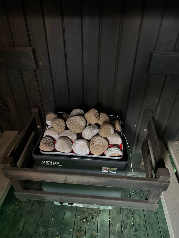 After maybe an hour or so, the new stove was installed and heating up. I use ceramic stones in my sauna and I think this Vevor absorbed about 15 kilos of them whereas Harvia would take about 20 kilos.