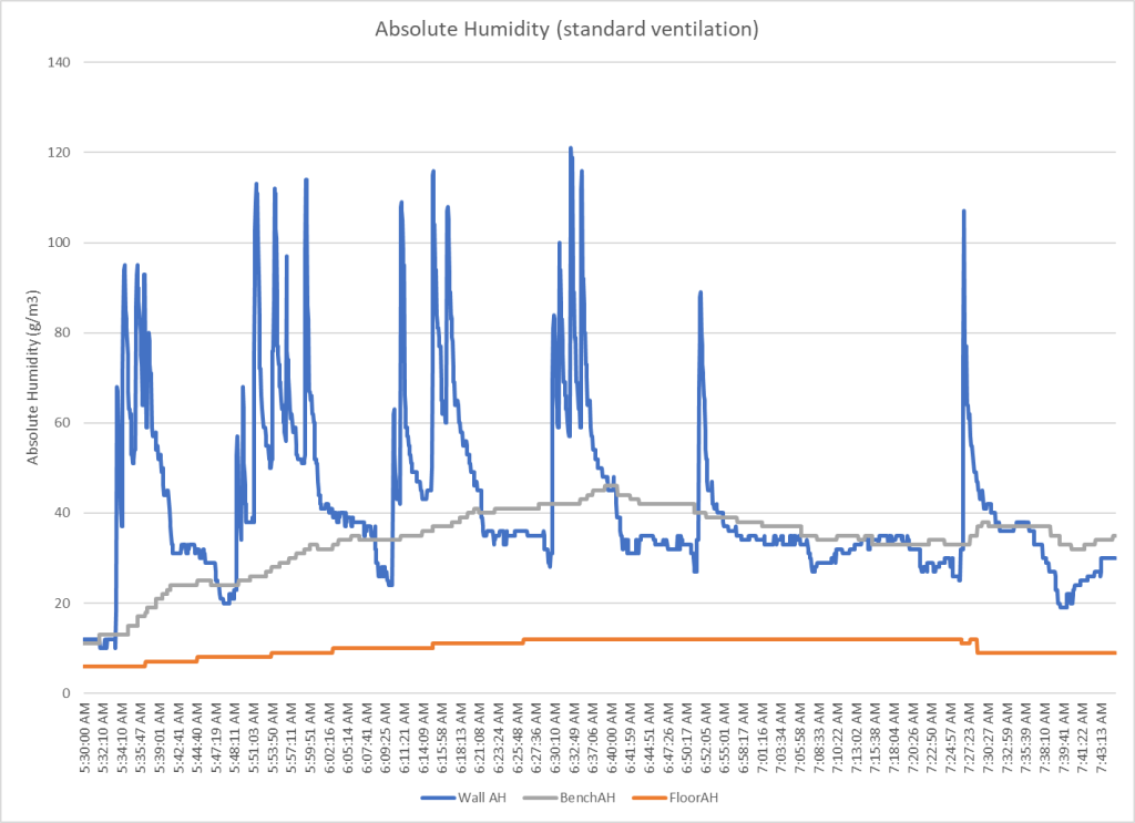 For starters, I measured temperatures and humidity first by using regular ventilation: cool air was sucked in from below the stove and I kept the exhaust vent closed so the air escaped from the gaps as air pressure increased after adding steam.