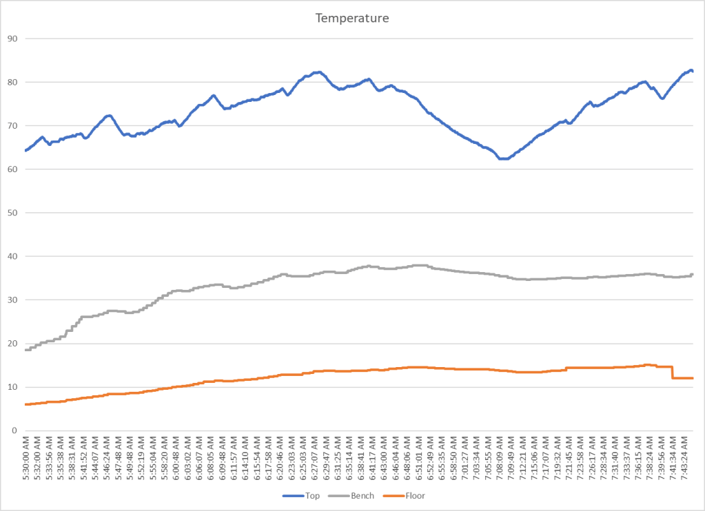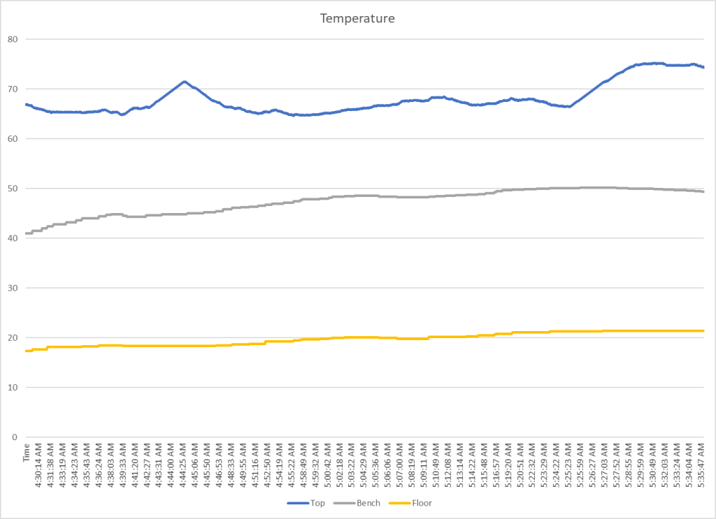 The readings were quite interesting this time as can be seen below. I managed to get the bench temperature above 65c with ventilation. The floor was still considerably colder but my top sensor is above my head so by keeping my feet on the opposite bench, I’d say the temperature difference between my head and legs was very minimal.