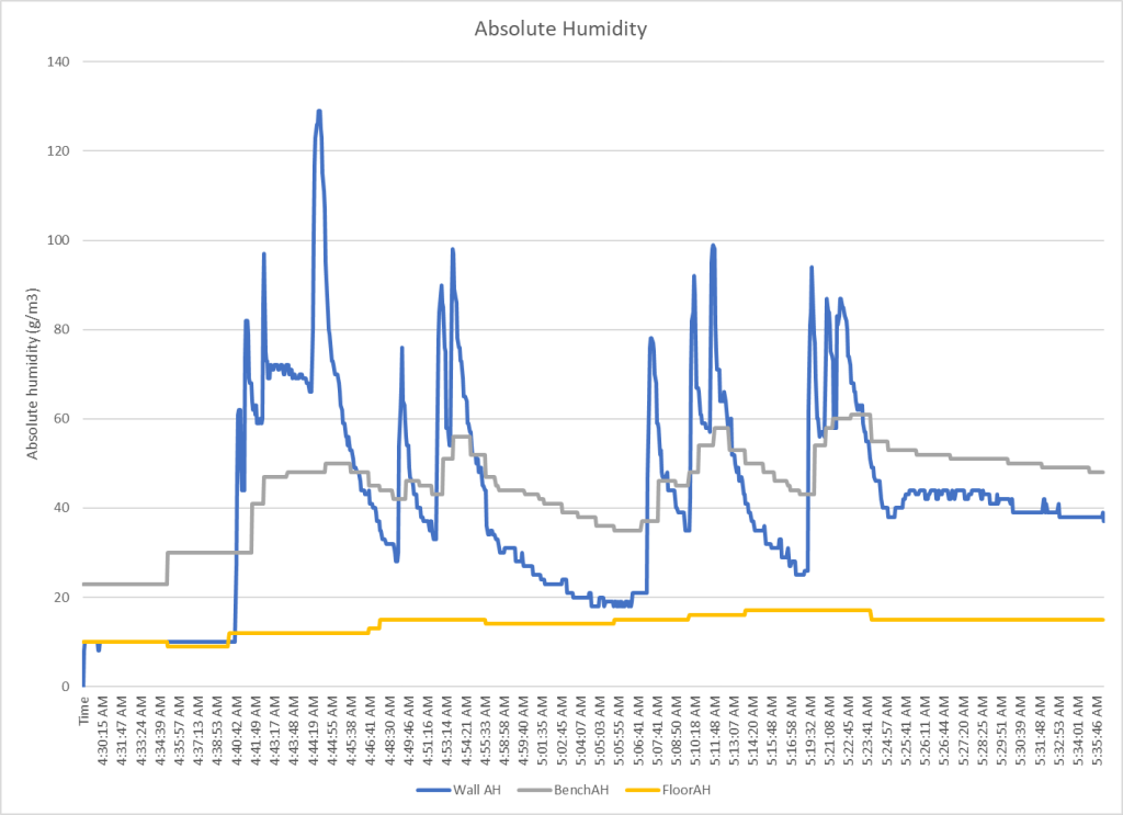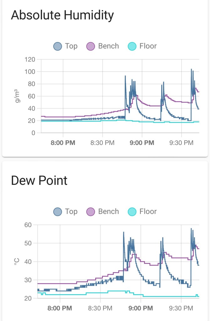 Looking at the humidity graph – you can see the readings in the top sensor spiking as I add steam. The bench sensor indicates that not much happens on that level. In other words, the steam goes to the roof level and stays there until the hot and humid air escapes from the gaps.