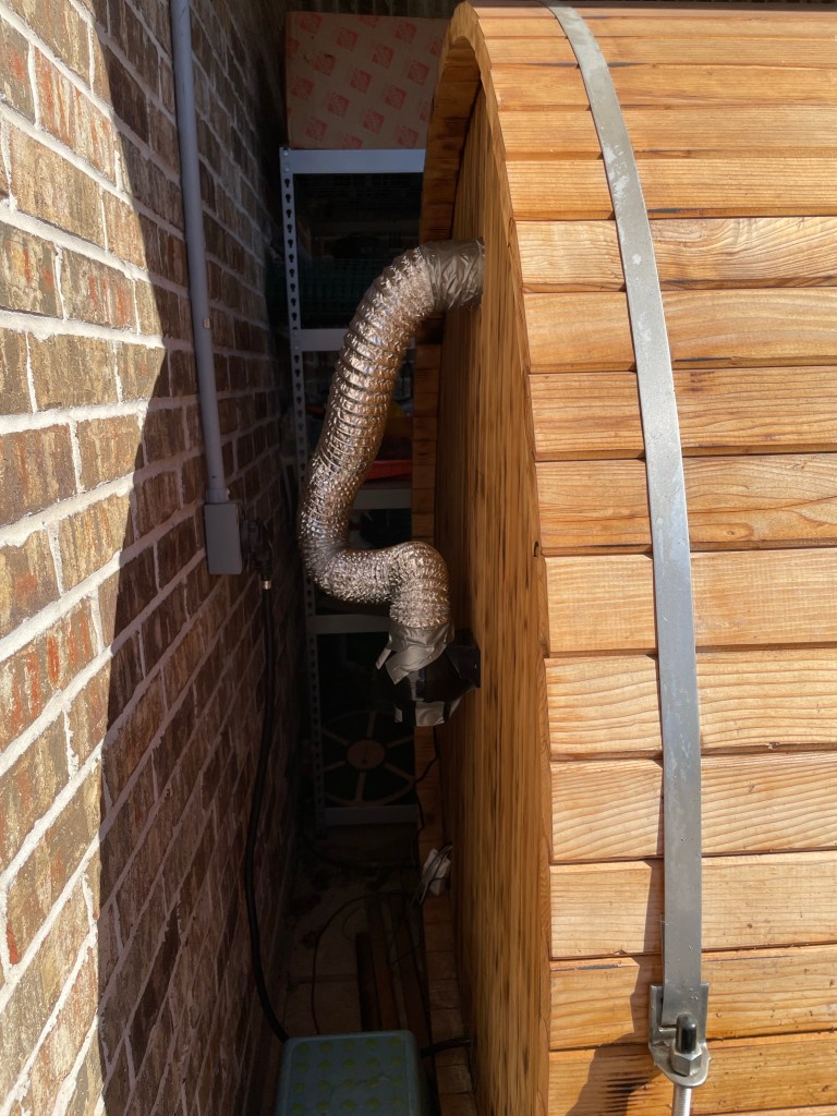 I added 4-inch vents above the stove and on the floor on the opposite side as illustrated in the pictures below. The location for the exhaust vent is a bit tricky due to the shape of the sauna. Somewhere on the lower part of the door would have been more ideal, but not very practical :).