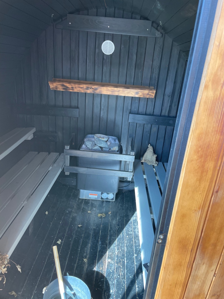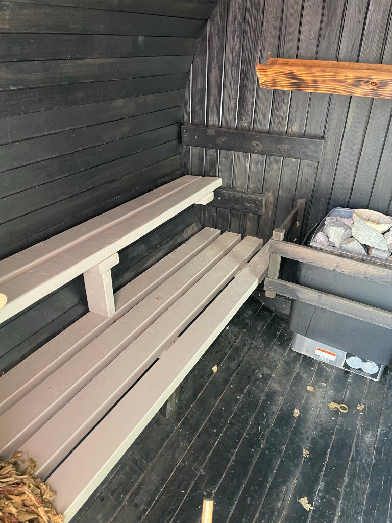 I tried the sauna for the first time in May 2022. The outside temperature was around 15c. We did about five rounds each day in the sauna and poured about five-six ladles water on each round. I would estimate that in each round we stayed in the sauna on average about 10-15 minutes and cooled down in the lake in between so with breaks, our sessions ended up lasting probably about three hours.