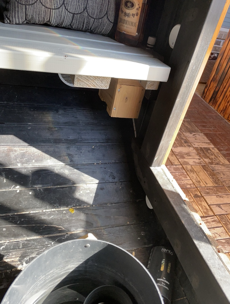 In addition to this ventilation hack, I also added an extra bench that slides in an out. It allows me to sit higher up and keep my feet on the opposing bench. I have also lowered the stove two inches so the benches are now closer to the top of the stove.
