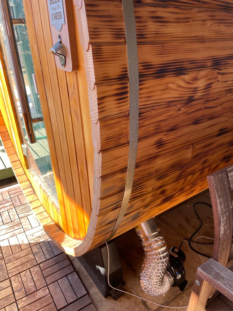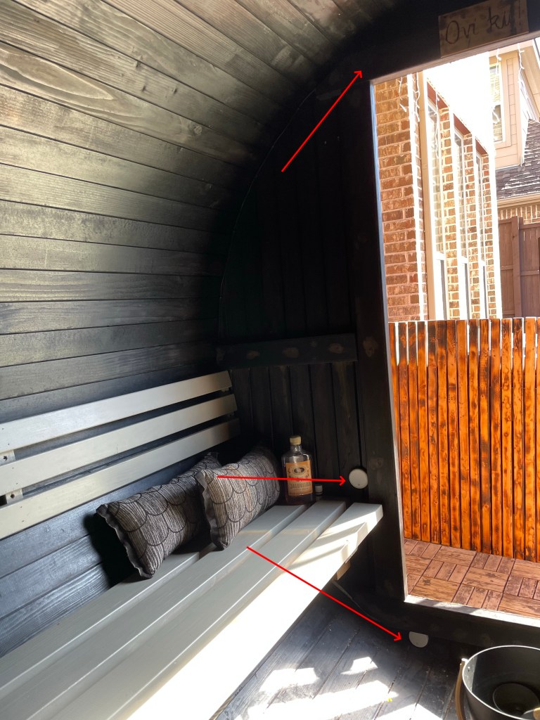 One challenge with this sauna design is ventilation and heat stratification. While the basic rule of löyly (steam) in Finnish saunas assume that your feet are above the top of the stove for better heat and steam experience, in barrel saunas you keep your feet on the floor. Another design choice in barrel saunas is that ventilation is often implemented using gravity based ventilation where air intake is on the floor level below stove and the exhaust is on the opposed wall on the top. This is probably the only meaningful way to implement proper ventilation without mechanical components but the downside is that this solution often creates draft on the floor and it further increases heat stratification.